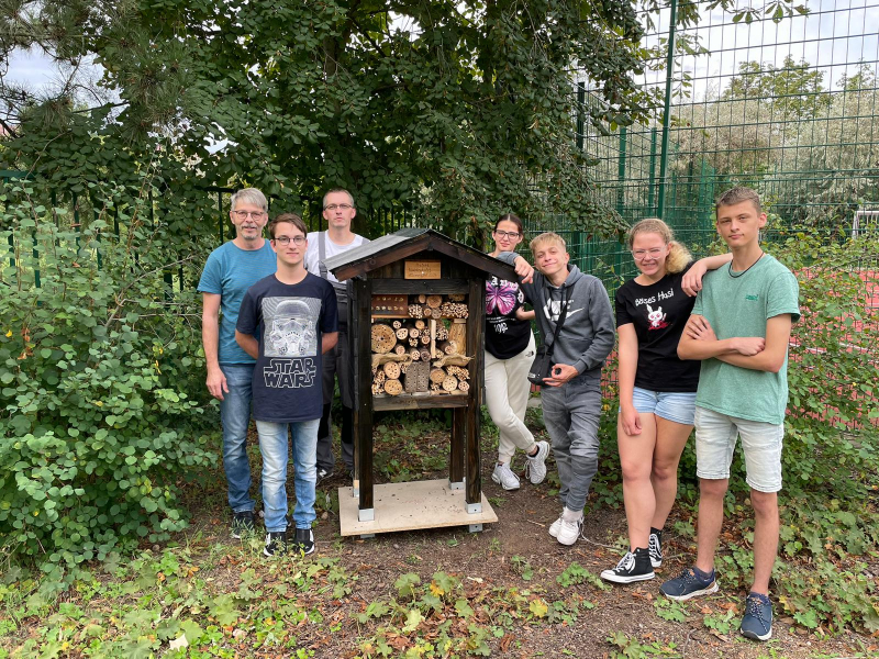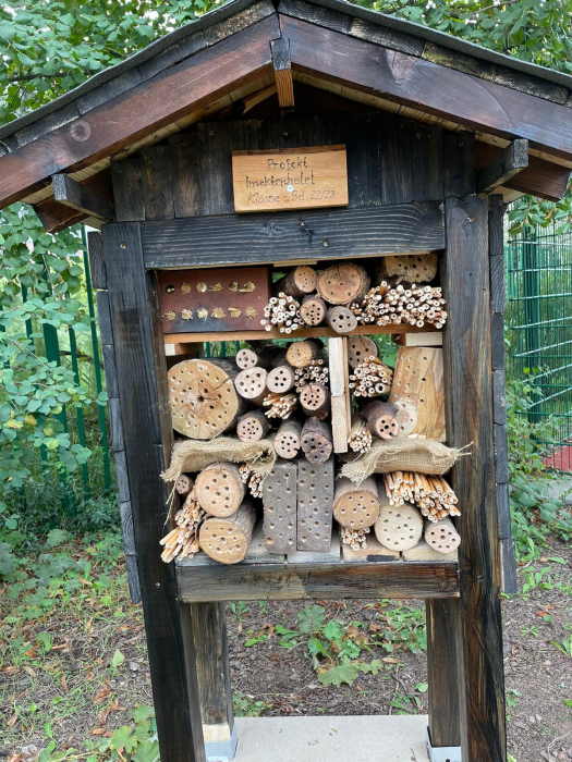 Gemeinsam mit unserem Hausmeister reifte die Idee, ein Insektenhotel für den Schulgarten mit der Klasse 8d (im Schuljahr 23/24) zu bauen. Nach vielen Vorschlägen brachten die SchülerInnen ihre Ideen auf`s Papier und wir konnten mit der Umsetzung beginnen. Alle Beteiligten waren freudig dabei und demnächst wird es seinen Platz finden. Und es hat einen schönen Platz gefunden.