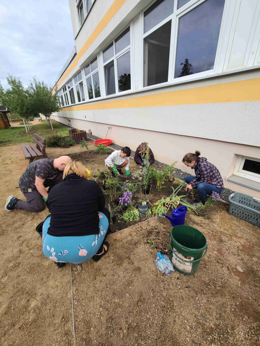 Seitdem hat es gut geregnet und das erste Unkraut ist entfernt. Wir sind gespannt, wie es im nächsten Frühjahr aussieht. In der Hinterhand haben Eltern und KollegInnen der Carpe Diem Schule noch ein paar Ersatzstauden für das Blumenbeet als Reserve.